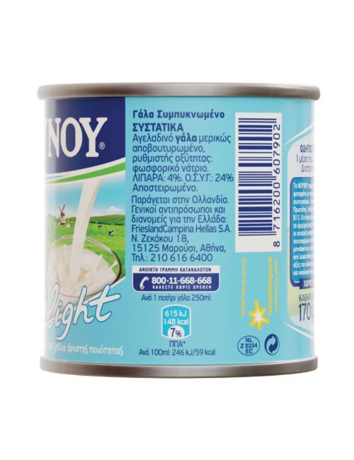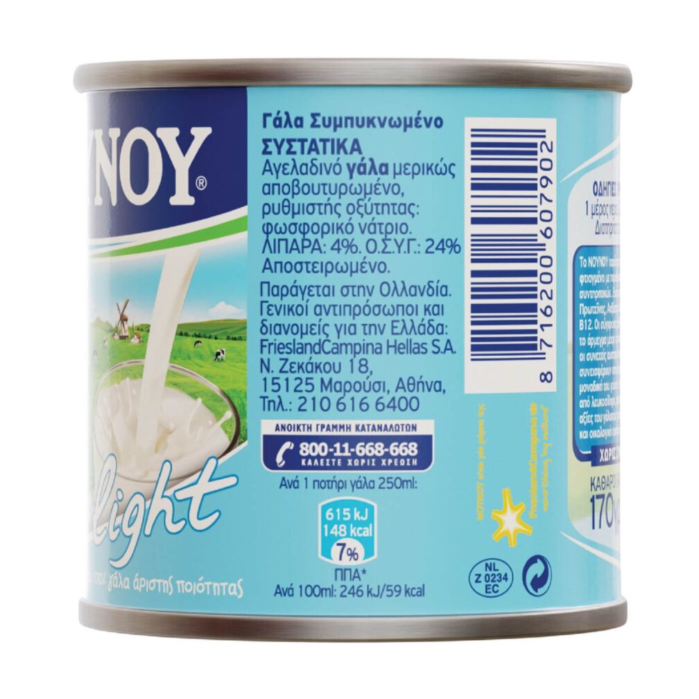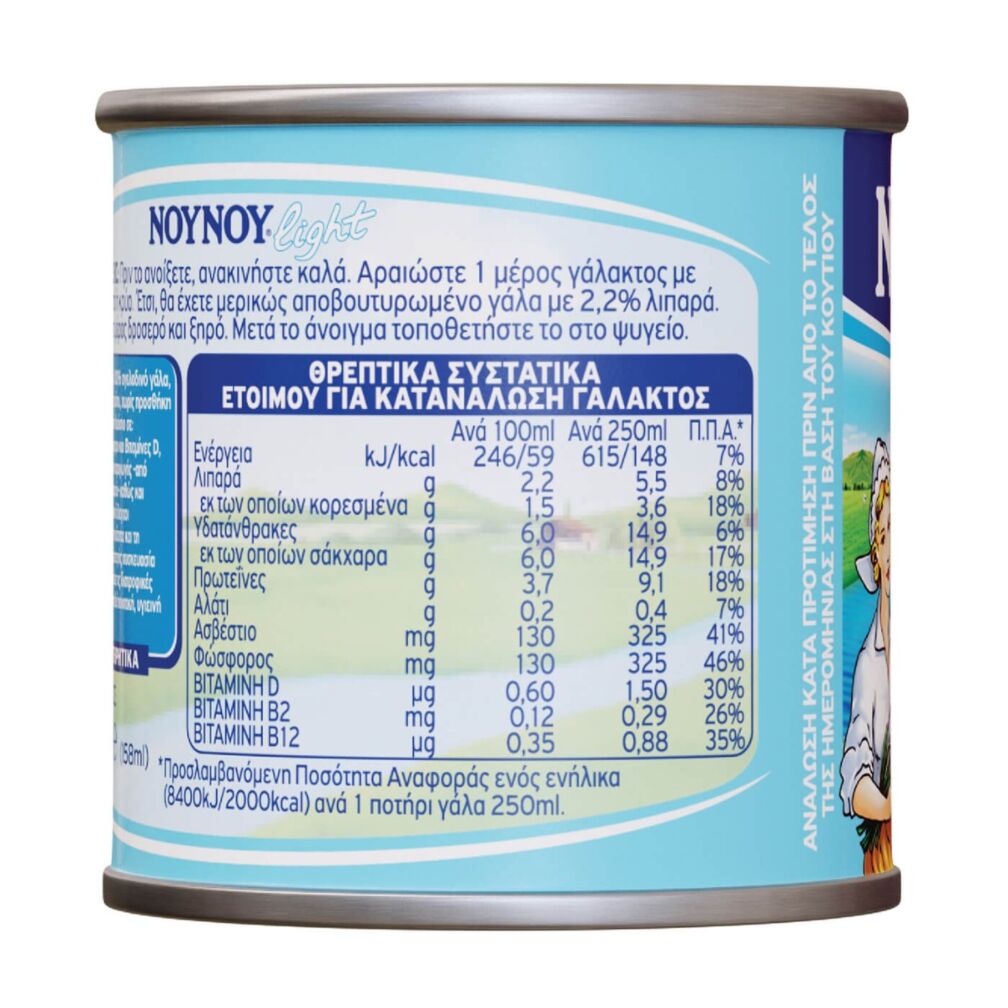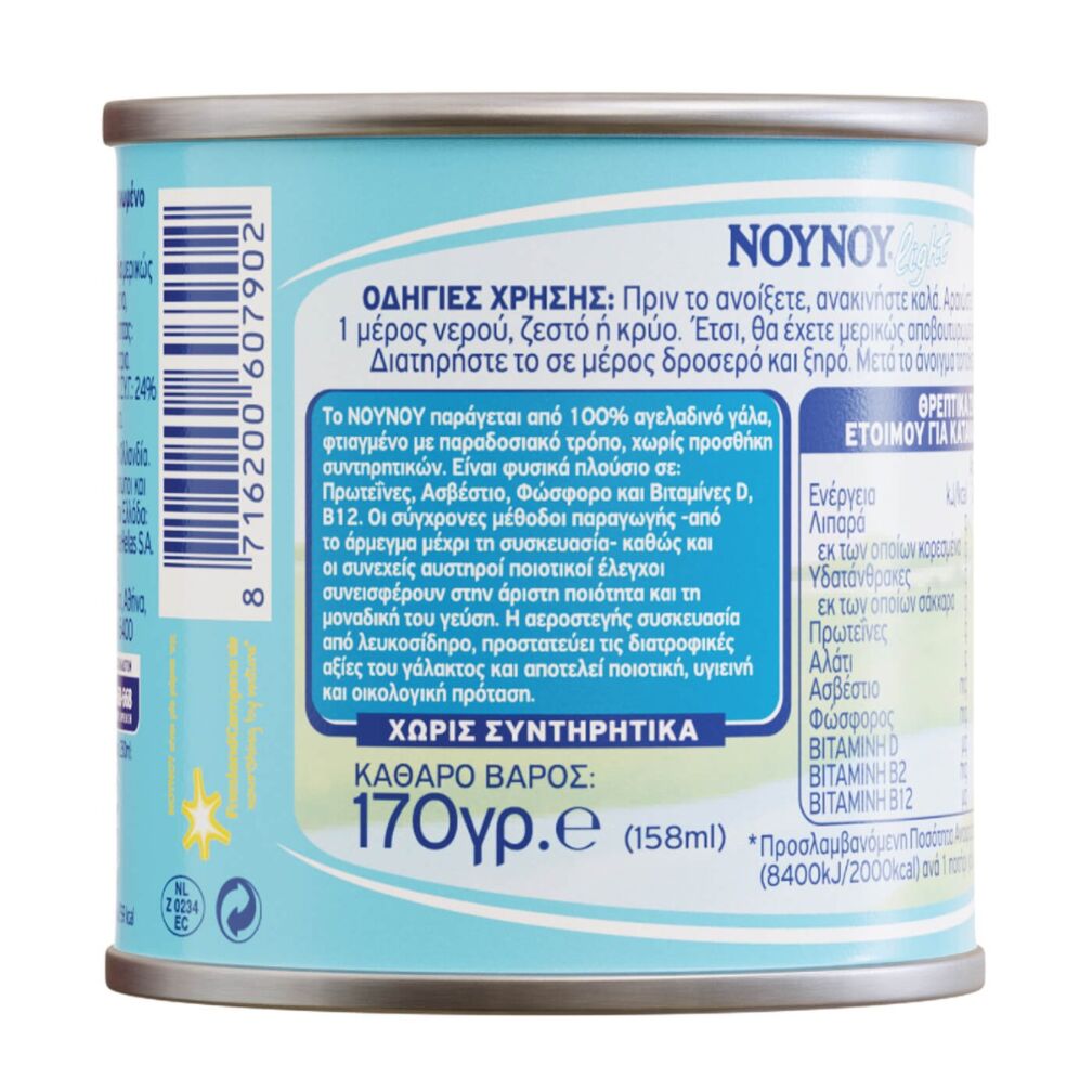 To NOYNOY Light παράγεται από 100% αγελαδινό γάλα άριστης ποιότητας, με απλή παραδοσιακή συνταγή, προσφέροντας τη θρεπτική αξία του γάλακτος και την υπέροχη γεύση ΝΟΥΝΟΥ με λιγότερα λιπαρά. H πλήρως αεροστεγής συσκευασία του από λευκοσίδηρο αποτελεί μια ποιοτική, υγιεινή και οικολογική πρόταση, που προστατεύει και διαφυλάσσει τις διατροφικές αξίες του γάλακτος, χωρίς την προσθήκη συντηρητικών.