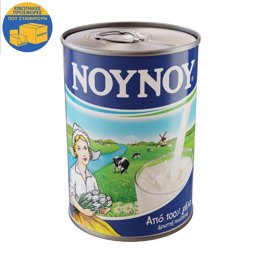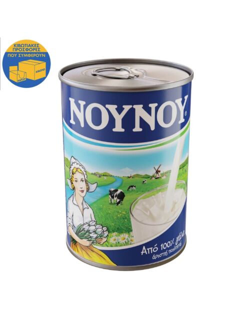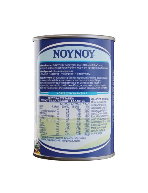 Το συμπυκνωμένο γάλα ΝΟΥΝΟΥ παράγεται από 100% αγελαδινό γάλα, άριστης ποιότητας και είναι φτιαγμένο με απλή, παραδοσιακή συνταγή. H πλήρως αεροστεγής συσκευασία του από λευκοσίδηρο αποτελεί μια ποιοτική, υγιεινή και οικολογική πρόταση, που προστατεύει και διαφυλάσσει τις διατροφικές αξίες του γάλακτος, χωρίς την προσθήκη συντηρητικών.