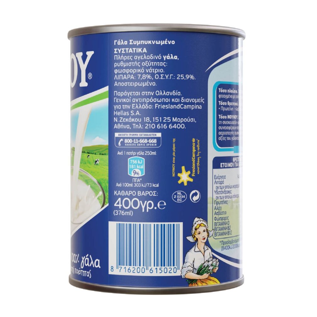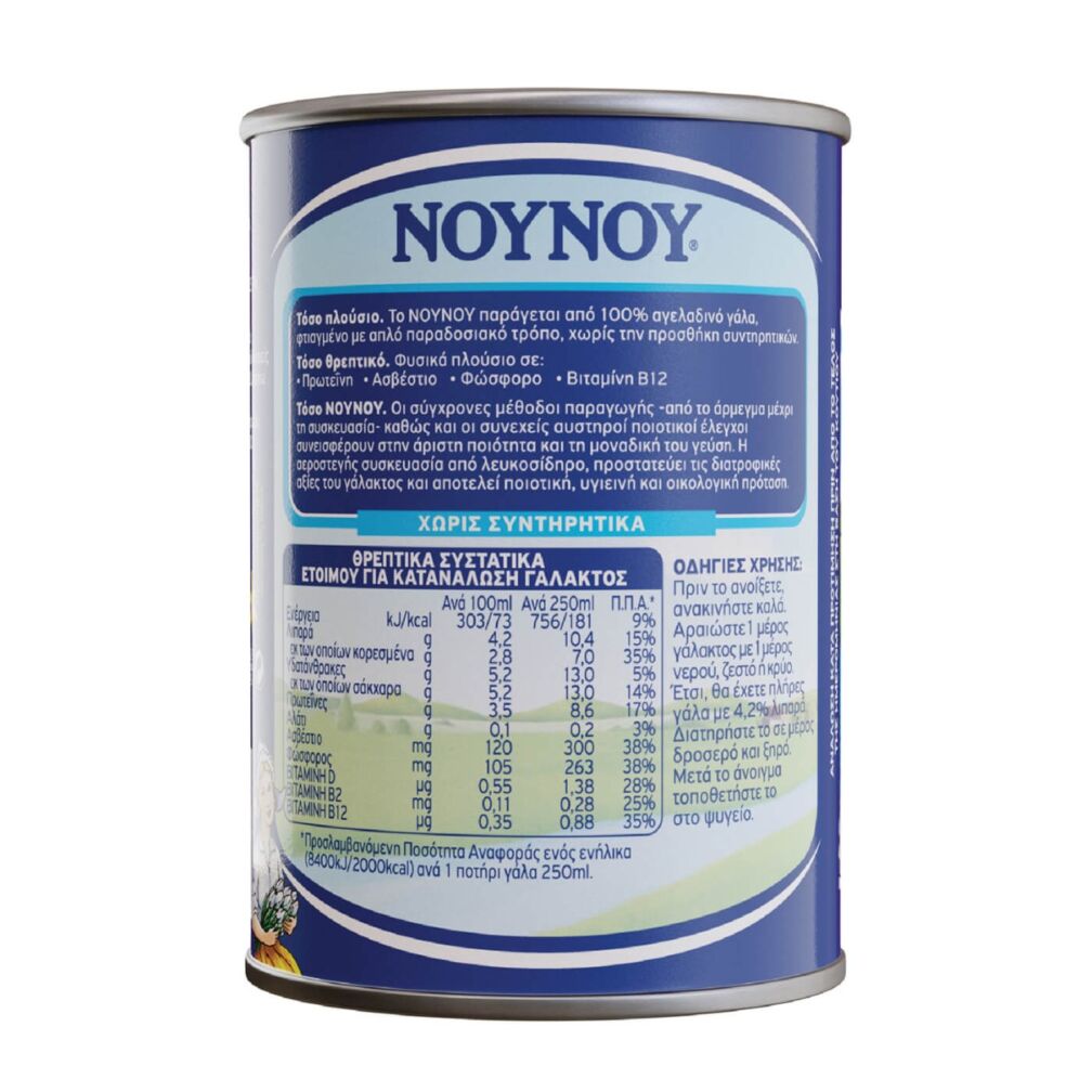 Το συμπυκνωμένο γάλα ΝΟΥΝΟΥ αποτελεί εγγύηση ποιότητας και θρεπτικής αξίας στη διατροφή της ελληνικής οικογένειας. Φτιαγμένο με πολλή φροντίδα, έχει υπέροχη γεύση και περιέχει όλα τα θρεπτικά συστατικά του γάλακτος σε ένα ποτήρι. Φυσικά πλούσιο σε Πρωτεΐνη, Ασβέστιο, Φώσφορο, Βιταμίνη D, Βιταμίνη Β12.